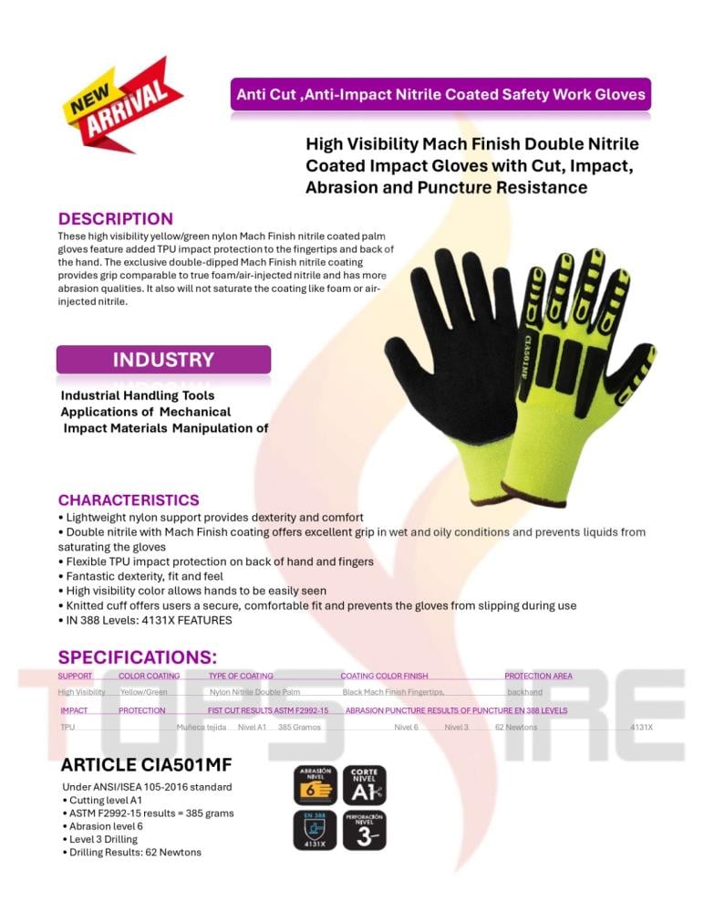 High Visibility Mach Finish Double Nitrile Coated Impact Gloves with Cut, Impact, Abrasion and Puncture Resistance